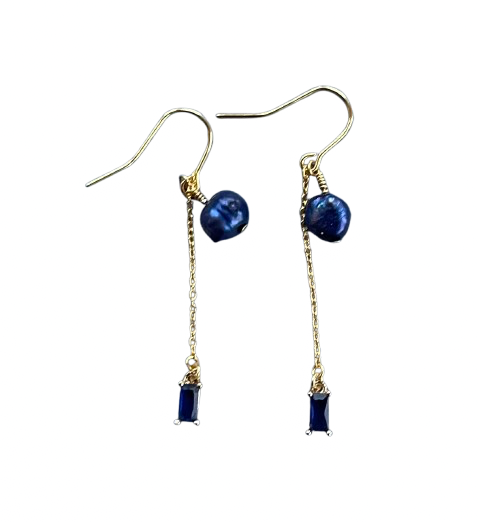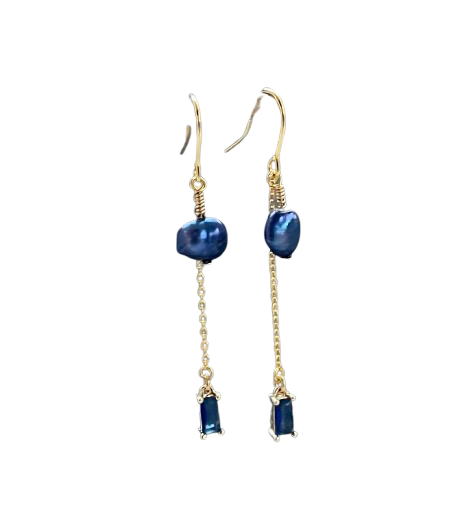 Kædeøreringe, elegant og tidløst håndlavet guld kædeøreringe med to blå zirkoner og flotte blå ferskvandsperler.